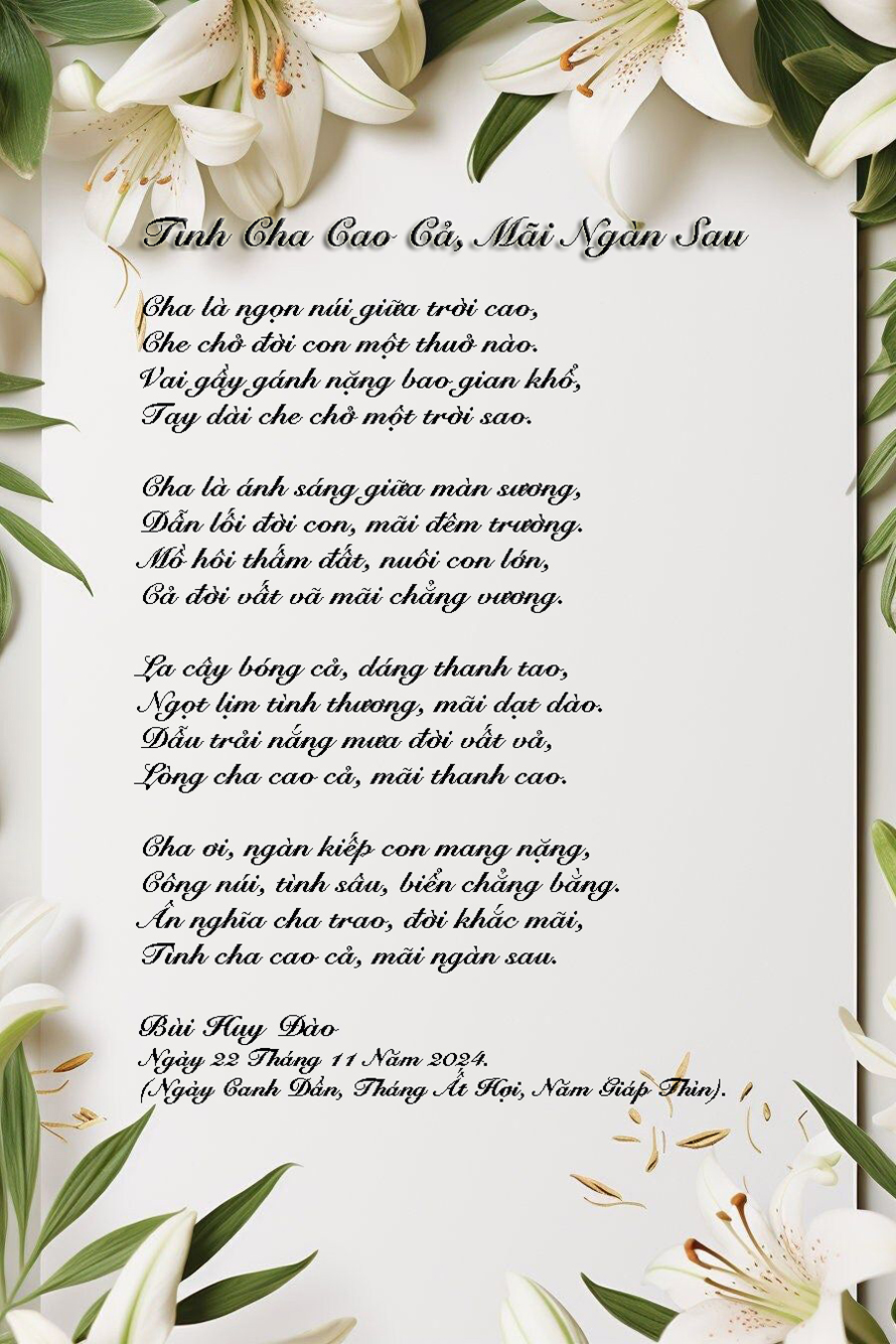 Cha là người đứng sau mọi giông bão cuộc đời, lặng lẽ che chở cho con bằng tất cả yêu thương, dù đôi vai gầy gánh nặng mưu sinh, và đôi lúc chính mình lại không có nơi để tựa vào. Tình cha không cần lời hoa mỹ, chỉ cần những hy sinh thầm lặng cũng đủ dựng nên cả một bầu trời bao la cho con nương tựa suốt cuộc đời. Dù có bao nhiêu khó khăn, cha vẫn luôn sẵn sàng hy sinh, không bao giờ đòi hỏi, chỉ mong con được bình yên, hạnh phúc. Xin chân thành cảm ơn quý khán thính giả gần xa đã dành thời gian đọc, nghe và cảm nhận bài thơ này.